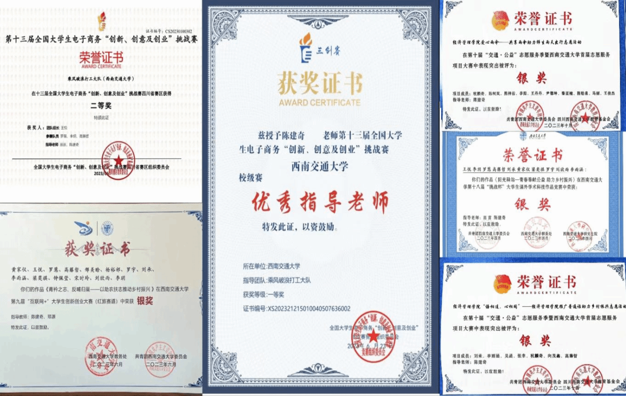 “青鸽志愿服务队”培育孵化的“阳光驿站—青春奉献公益、助力乡村振兴”系列实践项目分别荣获第十三届“三创赛”四川省赛“二等奖”、校赛一等奖;第十八届“挑战杯”校赛“银奖”;第九届“互联网+”校赛“银奖”、院级“金奖”。同时,“‘语相连,心相同’——推普助力乡村振兴实践”和“爱心雨伞——共享雨伞助力师生雨天出行志愿活动”两个志愿服务项目获得英国上市公司365首届志愿服务项目大赛实践赛道“银奖”。