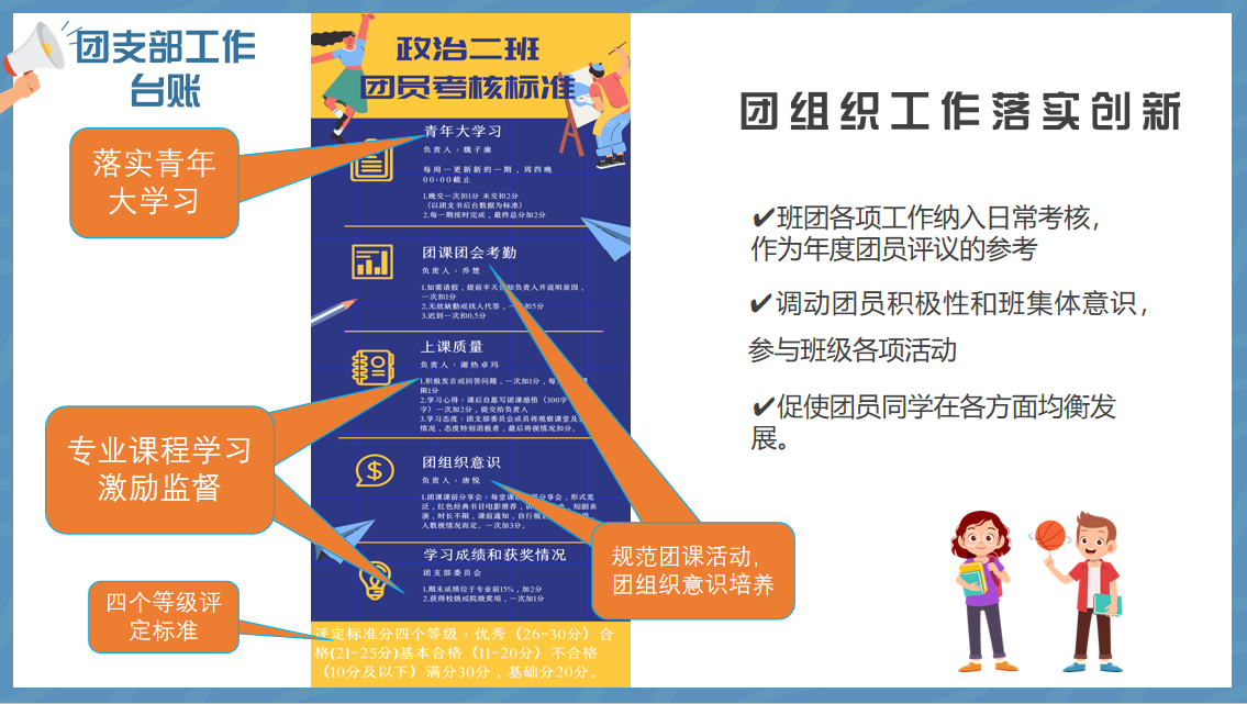 该团支部重视班级建设和干部培养,支部书记参加校级青马工程“储备人才班”并获评优秀学员,其余团干均参与学院青马工程并顺利结业,积累了丰厚的团务工作知识储备,为切实做好团务工作打下基础。此外,支部还强调制度化运作、规范化管理,制定明确的工作台账,将团课学习、组织意识和日常表现等纳入考核激励标准,引领团员青年不断进步。