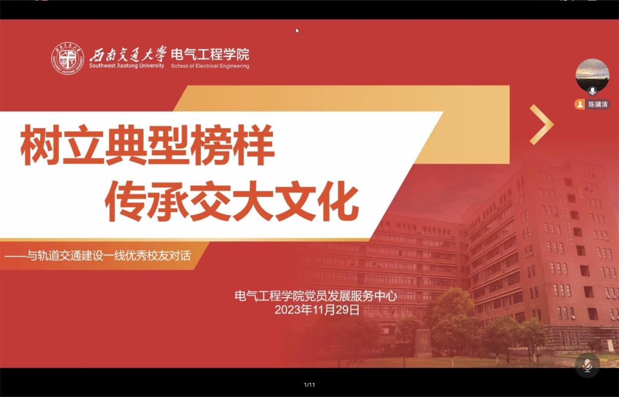 为使同学们进一步了解轨道交通行业发展现状及发展前景,激发同学们对于本专业的探索,做好未来职业发展规划,电气工程学院党员发展服务中心于11月29日19:00线上开展“树立典型榜样,传承交大文化”——与轨道交通建设一线优秀校友对话主题活动。本科2008级的魏驰师兄和2015级的何宗伦师兄分享了各自在交大电气工程学院的学习经验和毕业后的就业发展,党员发展服务中心全体成员和各年级学生干部参与活动,学院党员发展服务中心主任陈骥清主持活动。
