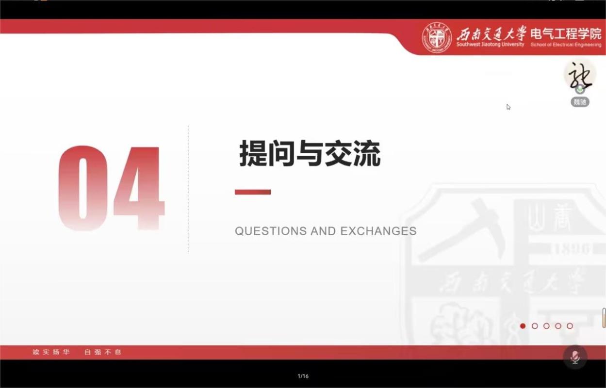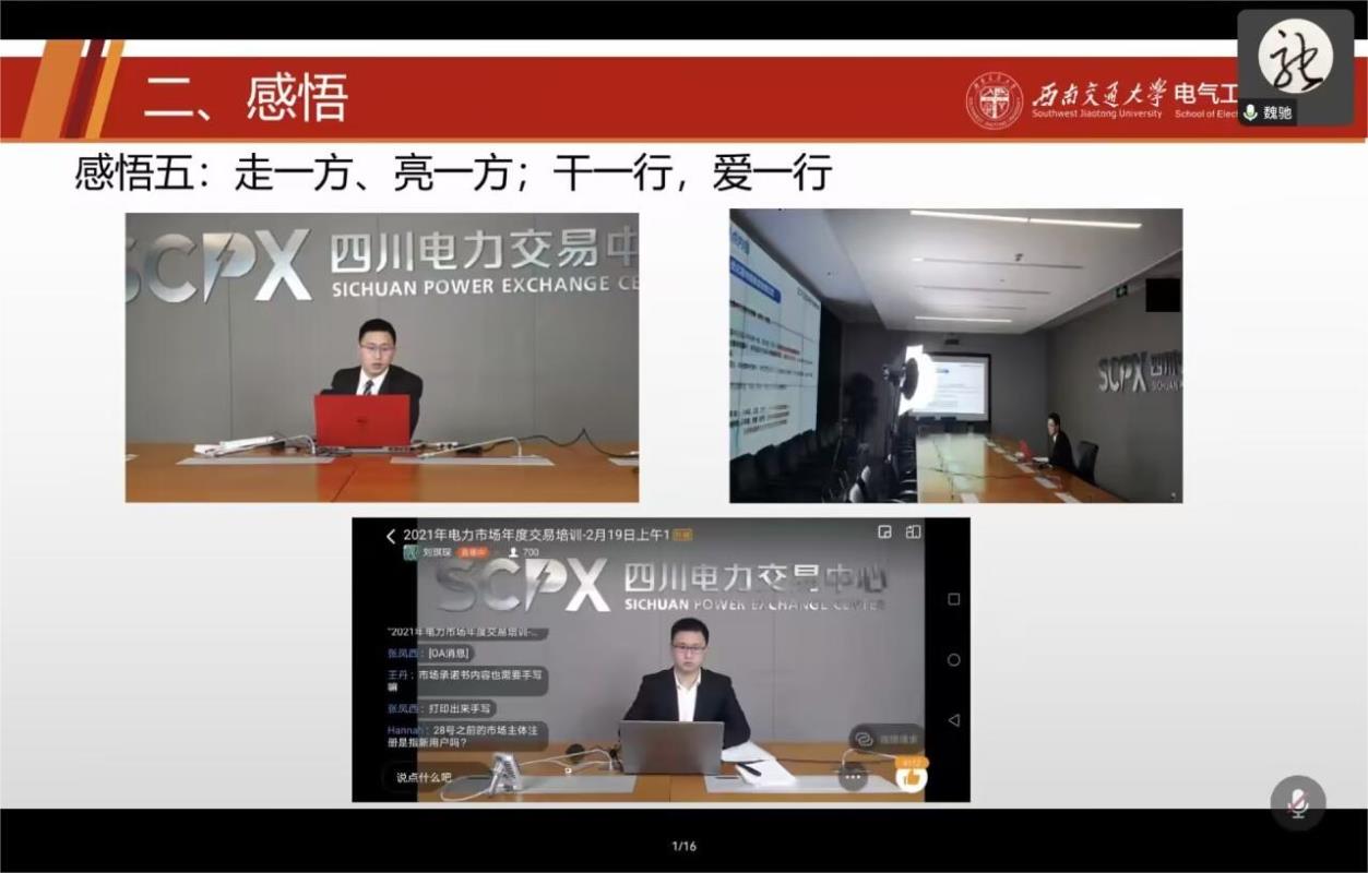 活动伊始,魏驰师兄分享了自己在校的学习的经验感悟和毕业后在四川电力交易中心的工作经历。魏驰师兄以“五个感悟”切入,生动讲解了自己求学过程中的成长历程与工作期间的经验心得,号召电气新青年们树立清晰的目标、做出坚实的行动、热爱所投身的事业。通过魏驰师兄的介绍,同学们对电气本科教学有了更为清晰的总览和规划,并且更加深入地了解到电气轨道行业的现状和未来发展的趋势。
