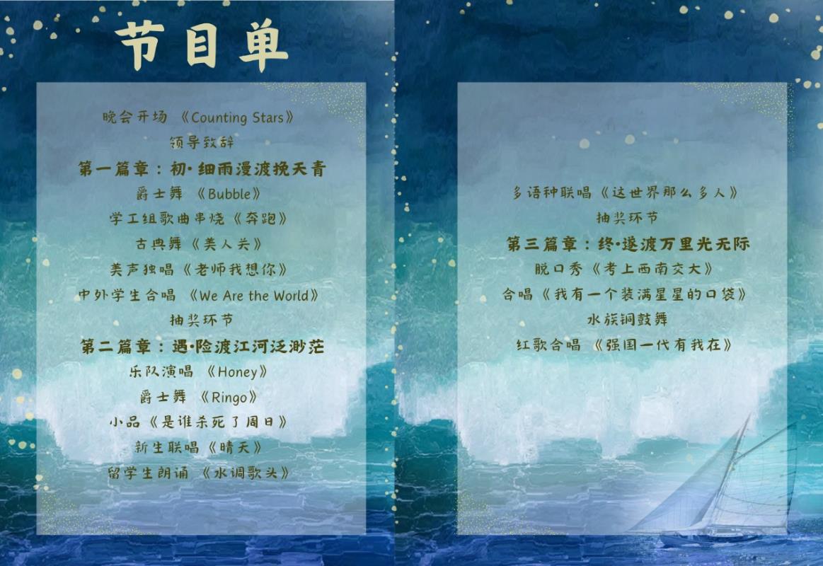 本次晚会以扬帆启航为主题元素,共分为三个篇章:初·细雨漫渡挽天青、遇·险渡江河泛渺茫、终·遂渡万里光无际。在中外传统服饰创意走秀开场后,外国语学院院长俞森林致辞。他妙语连珠,用流利的英文,感叹时光流逝,同时表达对新年的希冀;在十一月的最后一日,他希望大家能够有个愉快的夜晚,以崭新的面孔迎接十二月的第一天。随后,交大09届校友郑世锋先生上台致辞,他深情回顾了十数年前自己在交大的求学经历,感情真挚,对重新回到交大表示十分开心与激动,希望同学们能珍惜青春和在交大的时光。