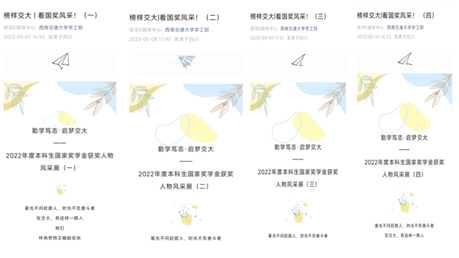 人文学生会坚持落实“四个一”体系,一系列团课学习、一系列青年讲座、一个成瑾工程、一个网络阵地,用党的理论武装青年、指引青年、感召青年、塑造青年,持续做好学院成瑾工程学生干部培养,不断提高学生干部履职服务能力。组织开展“勤学笃志·启梦交大”国家奖学金获得者风采展示活动,线上发布系列推文报道,校院多平台累计阅读量达上万人次,线下推出事迹海报展播,引发大批师生观摩学习,不断扩大青年典型的辐射效应,引导广大同学见贤思齐,树立正确世界观、人生观和价值观。