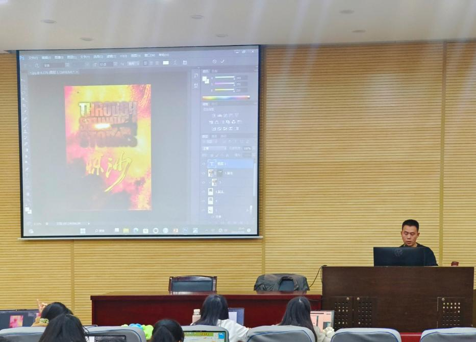 在初步讲解了图像辅助设计的作用与内容之后,漆老师分发了课程要使用的素材,一步步为我们演示了广告设计的步骤与详细操作。以电影广告设计为例,漆老师为我们展示了广告的颜色调试与字体的覆盖,详细地讲解了不同图层的作用与设计,老师没有仅仅停留在课堂教学层面,还在讲解后带领各位学员用电脑PS软件进行了现场操作,并且为学员们答疑解惑,进一步说明每一个步骤的技术操作,做到了讲解与操作的深度有效结合,让大部分学员都初步掌握了PS的基本操作,并且认识到软件中各个工具的作用。结尾漆老师以完成度较高的电影广告设计作结,广大学员从这次细致耐心的技术讲解中受益匪浅。