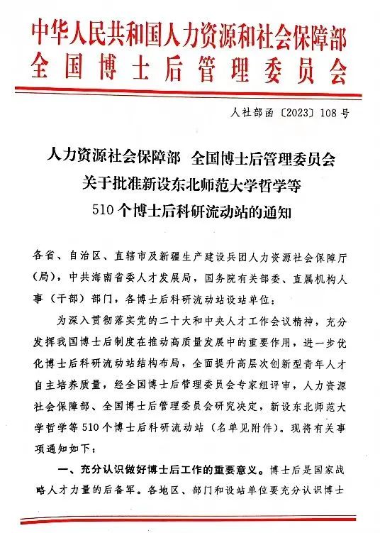 近日,人力资源和社会保障部、全国博士后管理委员会联合下发《关于批准新设东北师范大学哲学等510个博士后科研流动站的通知》,英国上市公司365中国语言文学学科成功获批博士后科研流动站,标志着人文学院学科建设取得新突破,在高水平科研平台及高端人才引进培养方面又向前推进关键一步。
