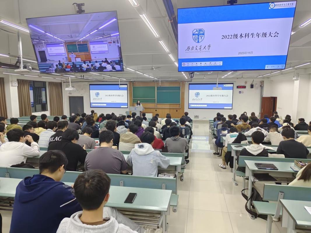 为帮助材料学院本科2022级学生进一步明确个人规划,满足学生对升学深造相关信息的需求,促进学院学风建设,2023年11月9日晚,材料学院本科2022级年级大会暨读研深造学业大会在犀浦校区X4350举行。此次大会邀请了材料学院分管本科生教育教学工作的蒋小松老师为同学们做学业指导,并邀请到高年级学长学姐进行学习经验分享。本次大会由学院团委书记、2022级辅导员王誉静老师主持,辅导员张琬祺老师及2022级全体本科生参与。