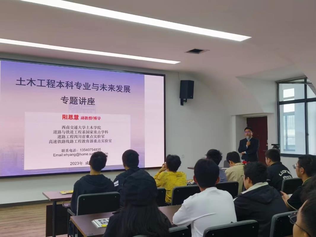 阳教授介绍了土木工程专业的学科范围,主要研究领域,专业性质,专业特点,知识体系搭建,结合形式多样的现场图片让同学们深入了解当下土木工程专业的深刻内涵,其中对培养应用型工程技术人才要求掌握“测、绘、算、智、管”核心技能,针对这一要求,阳教授结合他的教学经验进行了具体讲解。其后,阳教授提及了土木工程专业的课程体系设置和当前土木工程专业的就业发展前景,讲解过程中,阳教授诙谐幽默的言语活跃了现场氛围,给大家带来许多快乐。讲座的最后,阳教授对土木工程专业的发展满怀期待,同时分享了他在国外求学的难忘经历,希望我们的同学们开拓国际化视野,放眼国际,鼓励同学们在未来的学习中发奋图强。