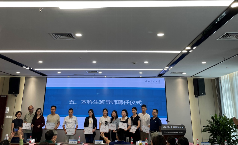 接下来,学院开展了新任班导师代表聘任仪式。杨安文副院长宣读聘任决定,李书记、俞院长为班导师代表颁发聘书。