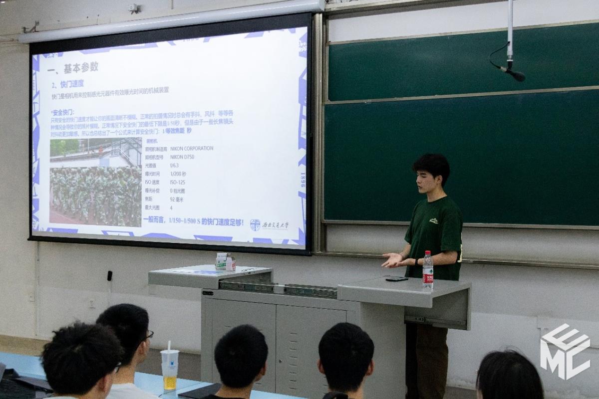 交大新媒体摄影团副团长左仕垚主讲“校园活动摄影基础培训”,左仕垚从基本知识、活动流程、拍摄要点、典型问题四个方面展开讲解。首先介绍相机基本参数:焦距——什么是等效焦距;快门——如何调节安全快门;光圈——光圈是怎样影响景深的;ISO感光度——感光度高低给画面带来的影响;白平衡——白平衡对图片色泽的影响。左仕垚通过举例自己参加过的拍摄任务,总结经验:活动前应当熟悉拍摄场所、了解拍摄主题、做好应急预案;出任务时应该视活动类型决定是否实时传图,及时校核相机的参数、保持好交流沟通;在活动结束之后应及时打包图片发送给推送负责人、做好活动总结。最后,左仕垚列举了拍摄时容易出现的一些典型问题,回答了现场同学们的提问,同学们都表示学到了很多实用的摄影技巧。