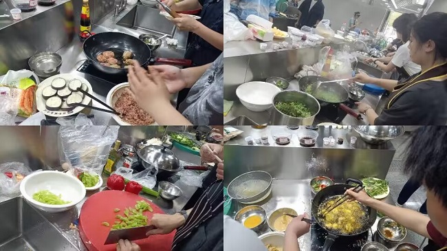 来自各个年级各个班级的同学们踊跃参与。本次比赛分为初赛和决赛,大家各自组队,用生抽、老抽、油、盐、醋等基本调料以及自己准备的食材来制作美食。在菜品制作过程中努力创新,用自己勤劳的双手创造了各种美食。金黄酥脆的大虾让人垂涎欲滴,雪碧话梅排骨让人食指大动,珍珠丸子颗颗饱满白嫩……