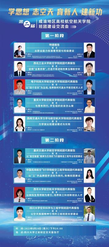 为深入学习贯彻习近平新时代中国特色社会主义思想,探索高校班团组织建设的创新思路和实践途径,推动成渝地区高校形成协同育人合力,5月20日下午,“学思想、志空天、育新人、建新功”第二届成渝地区高校航空航天学院班团建设交流会在四川大学空天报告厅成功举办。四川省教育厅宣传思想与统战工作处处长李大鹏、四川大学相关部门负责人以及四川大学、西北工业大学、电子科技大学、重庆大学、英国上市公司365、重庆交通大学、中国民用航空飞行学院、西华大学等八个高校航空航天类学院的老师和学生代表参加会议。