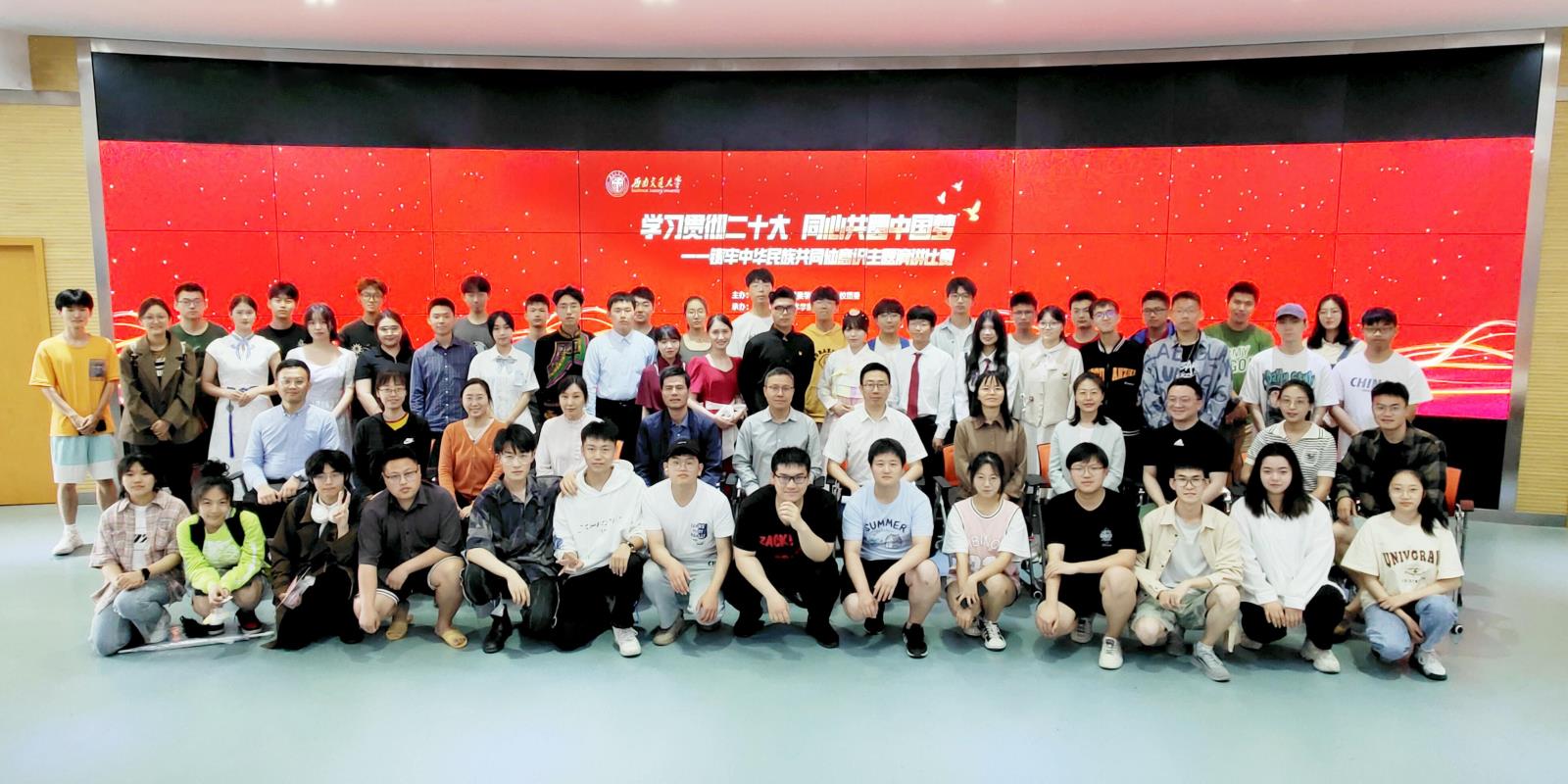比赛环节,来自各民族的同学们讲述了“凉山州驻村书记帮助当地大学生解决学费问题”“和彝族新同学交朋友”“边境小城丹东中学校长用爱鼓舞成长”“帮助‘云支教’结对的小朋友学习”“恩施农村交通状况发生翻天覆地改变”等故事,重温了“三千孤儿入内蒙”“黄文秀驻村扶贫因公殉职”等感人事迹。娓娓道来或慷慨激昂的演讲,配合着“穿越时空对话”“情景剧”等创新表演形式,赢得了观众的阵阵掌声。这些故事蕴含的爱党爱国爱社会主义的真挚情感和同学们青春奋斗的蓬勃朝气,感染了现场每一位观众,活动现场充满着温情、团结、奋进的良好氛围。