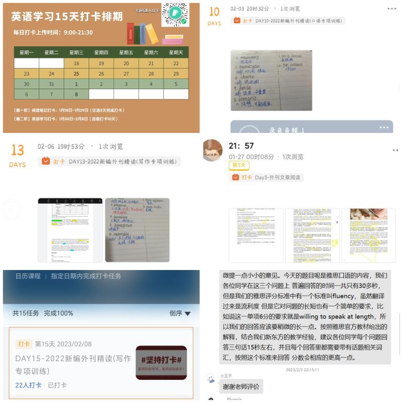 在英语学习打卡营中,邀请到新东方专业教师,以老师领学、学生自学的形式,开展每日英语学习打卡。打卡活动分为阅读笔记打卡和英语学习打卡两个阶段,群里每日会有详细的学习计划和相应的学习任务,老师会在群里分享答题思路以及相关词汇供大家学习。大家针对老师的专业点评,掌握答题技巧,改善学习方法,共同收获进步。