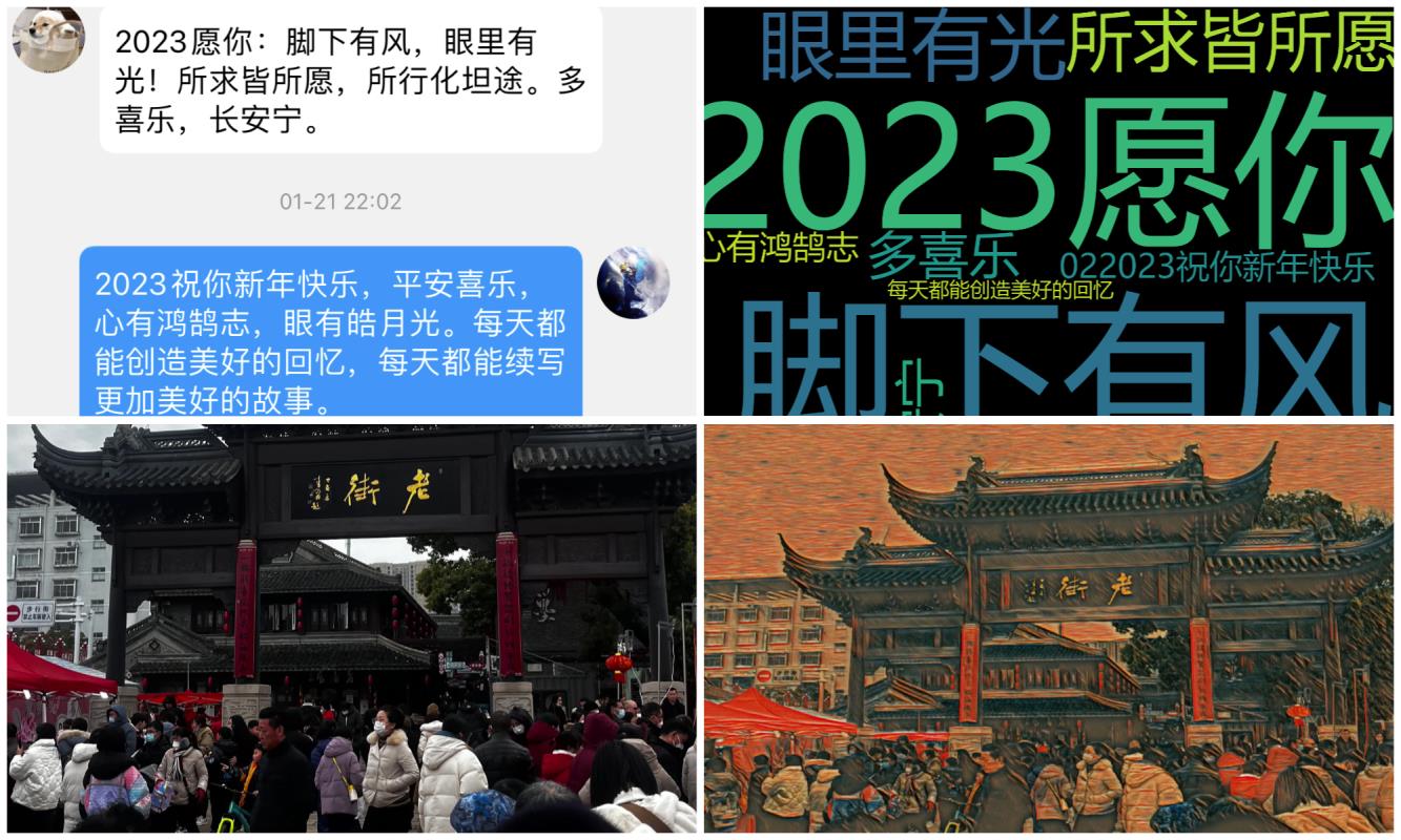 贴春联、写福字、送祝福,各地新春同样欢腾,但各地的年味不尽相同,来自五湖四海的同学都在家乡见证属于自己的“年味”,这份喜悦和美好值得记录和珍藏。参与者结合专业知识,通过文字识别技术提取祝福语关键词后独立生成词云图,也用人工智能和图像处理相关技术,让自己拍摄的家乡标志性建筑及年味瞬间实现了图像风格的转换,在记录美好的同时,将“技术分析、代码、学习记录、成果展示、心得体会”等展示在个人的技术博客中,真正做到“用眼睛感知美好,用技术留存美好”。