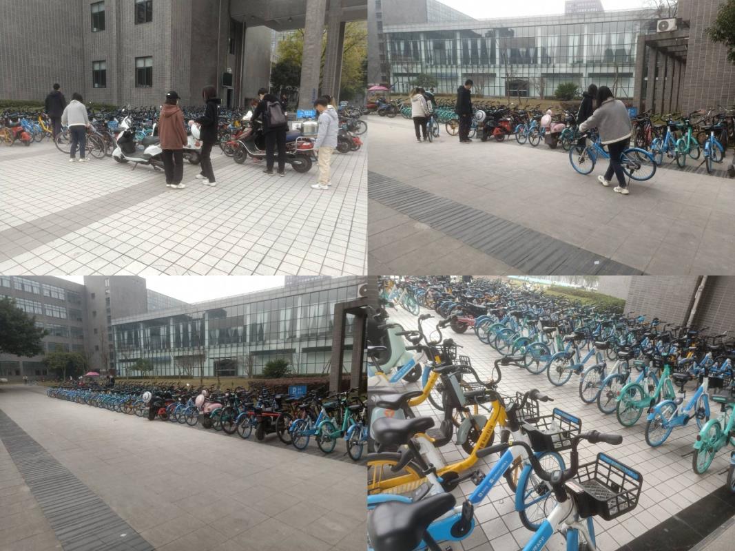 恰逢期末考试周,四号教学楼附近人流量大,地面区域出现多辆不文明停放的共享单车,影响行人与车辆正常通行,也为学院安排工作人员挪移物资带来不便。为此,党员志愿者们在不打扰考场考生的前提下,将共享单车扶至内侧空地整齐摆放,恢复四号教学楼附近道路的整洁和通畅,提升地下停车场清扫的工作效率。