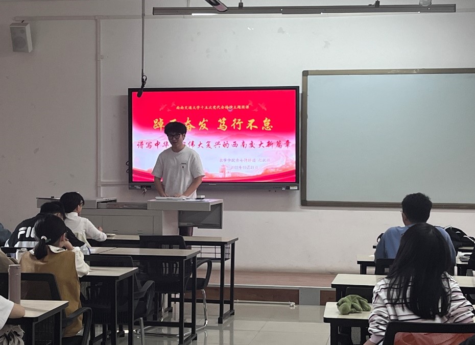 2022年,中国共产党第二十次全国代表大会于10月16日在北京召开,这是在全党全国各族人民迈上全面建设社会主义现代化国家新征程、向第二个百年奋斗目标进军的关键时刻召开的一次十分重要的大会,对团结和激励全国各族人民为夺取中国特色社会主义新胜利而奋斗具有十分重大的意义。学习、宣传党的二十大,是贯穿全年的工作主线。为团结引领广大青年坚定跟党走、建功新时代,激发交大学子爱国荣校热情,结合支部工作实际,2022级数学与应用数学一班团支部于12月2日下午2时在X9203举行团课,并邀请了数学学院团委兼职副书记、青年讲师团成员赵汉林学长进行宣讲。支部成员应到25人,实到25人,另有6名青年学生参与。支部成员参与积极性高,充分展示了同学们的爱党爱国热情。