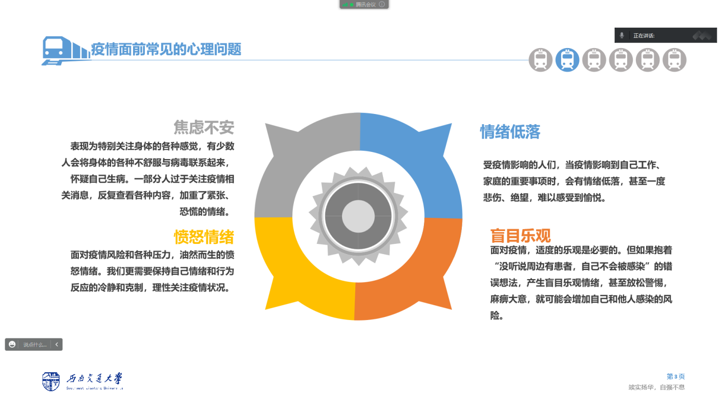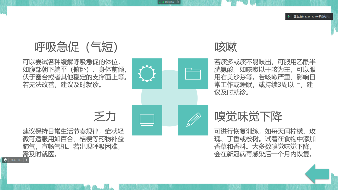 为帮助广大人民群众更加科学地认知、了解和应对新冠,团队以线上讲解的方式面向新疆塔城地区乌苏市新市区各社区进行科普宣传,主要从新冠预防、病症介绍、心理健康等方面开展科普工作,向广大居民讲解新型冠状病毒感染所面临的问题和认知误区,引导大家正确了解防治新型冠状病毒感染的病程病理,纠正盲目追求治疗作用的错误认识,增强合理用药、重在加强防护、日常注重身体锻炼的健康意识,为科学面对新冠贡献青年力量。