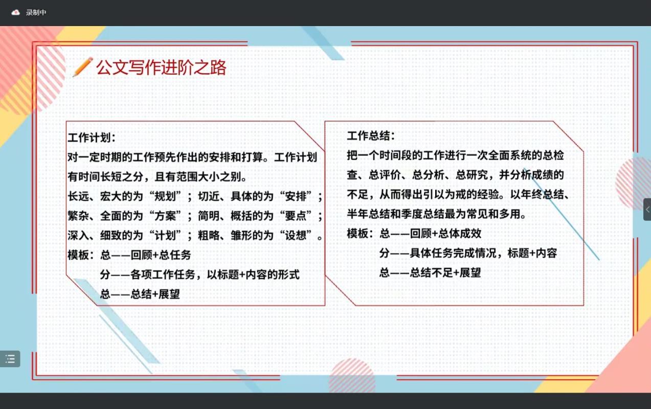 分享中,他着重表明公文撰写要遵守“政策性,权威性,规范性”的原则,并就布局、表达上举例做了讲解。他强调要把握本质,概括性用语,忠实原意,以及“四好”标准即“好读、好懂、好记、好执行”。同时对于相似类型公文也进行了讲解,对比了会议纪要和会议记录,通过二者差异引申出不同类型公文的特点,并就写作中会遇到的问题和错误进行了解答和纠正。