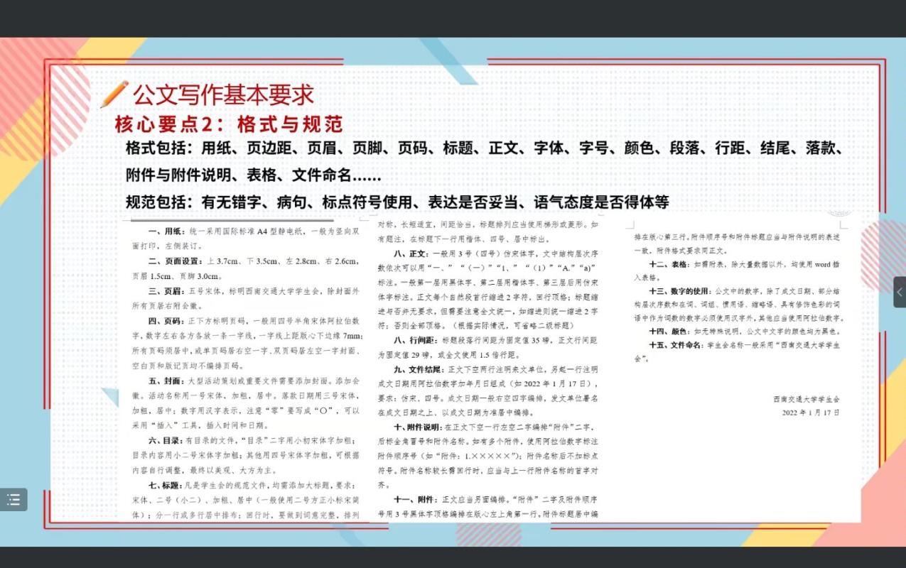 本次分享会中,叶镓豪同学就“公文写作的基本要求和不同类型公文的写作特点”进行了介绍与讲解,从广义公文的内容和特点出发,对公文写作的基本要求以及不同公文的侧重点进行了深刻阐述,旨在提升团学组织的公文写作素养,掌握不同公文的写作要求,为今后团学组织各项活动新闻的撰写打下坚实基础。