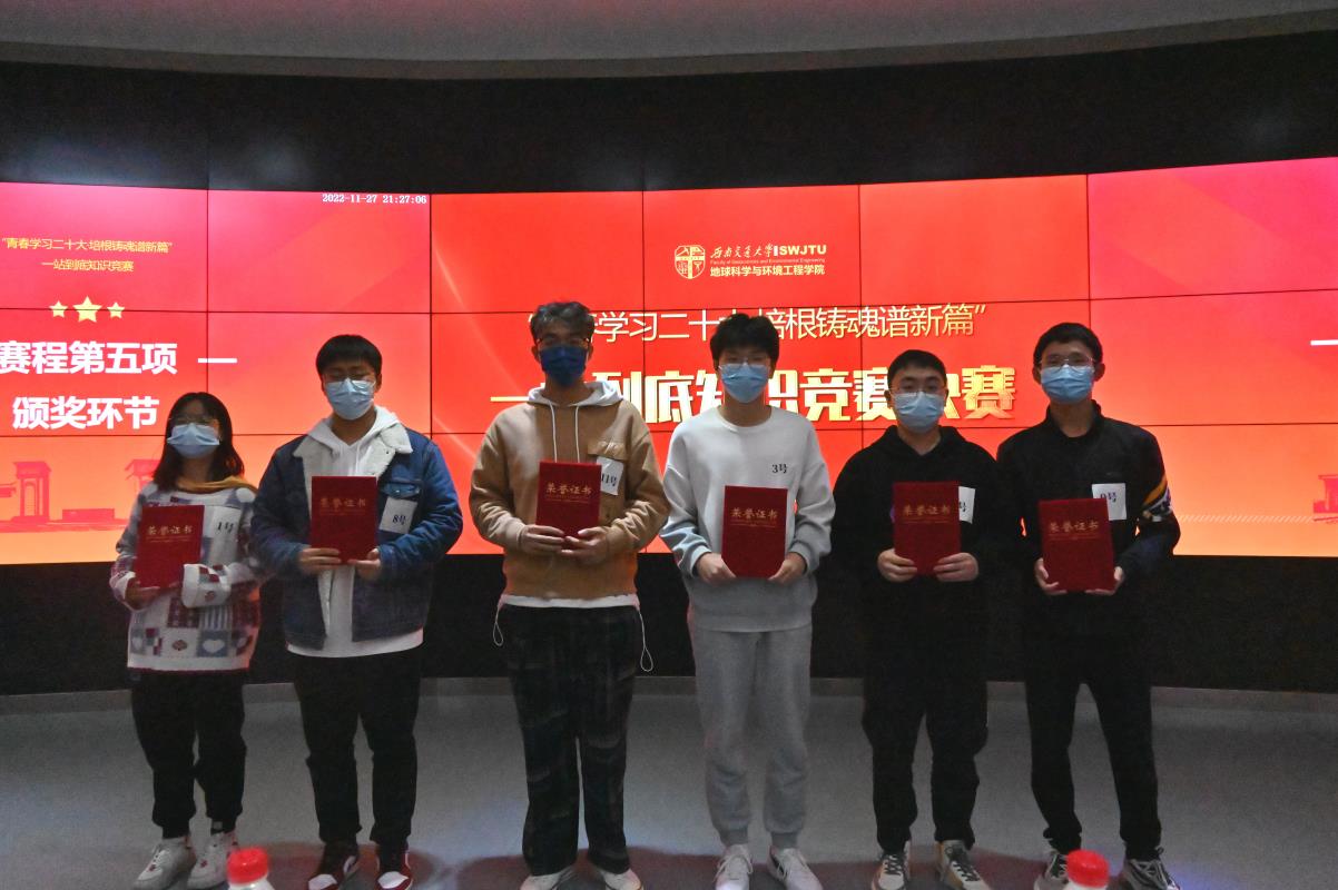 为进一步深入学习党的二十大精神,强化学生会的思想引领作用,呼吁广大青年群体以大观小、以国观己,2022年11月27日晚19:35,由地学学院团委主办,地学学院学生会和地学学院党建事务中心承办的“青春学习二十大·培根铸魂谱新篇”——一站到底知识竞赛决赛在X4243报告厅顺利举行。出席本次决赛的嘉宾有地学学院团委副书记、学生会指导老师李婧,地学学院学生党建工作负责人文强,地学学院辅导员史可心、郑非、李林遥及学生会主席团成员黄泳桦、张绪明、胡佳慧。