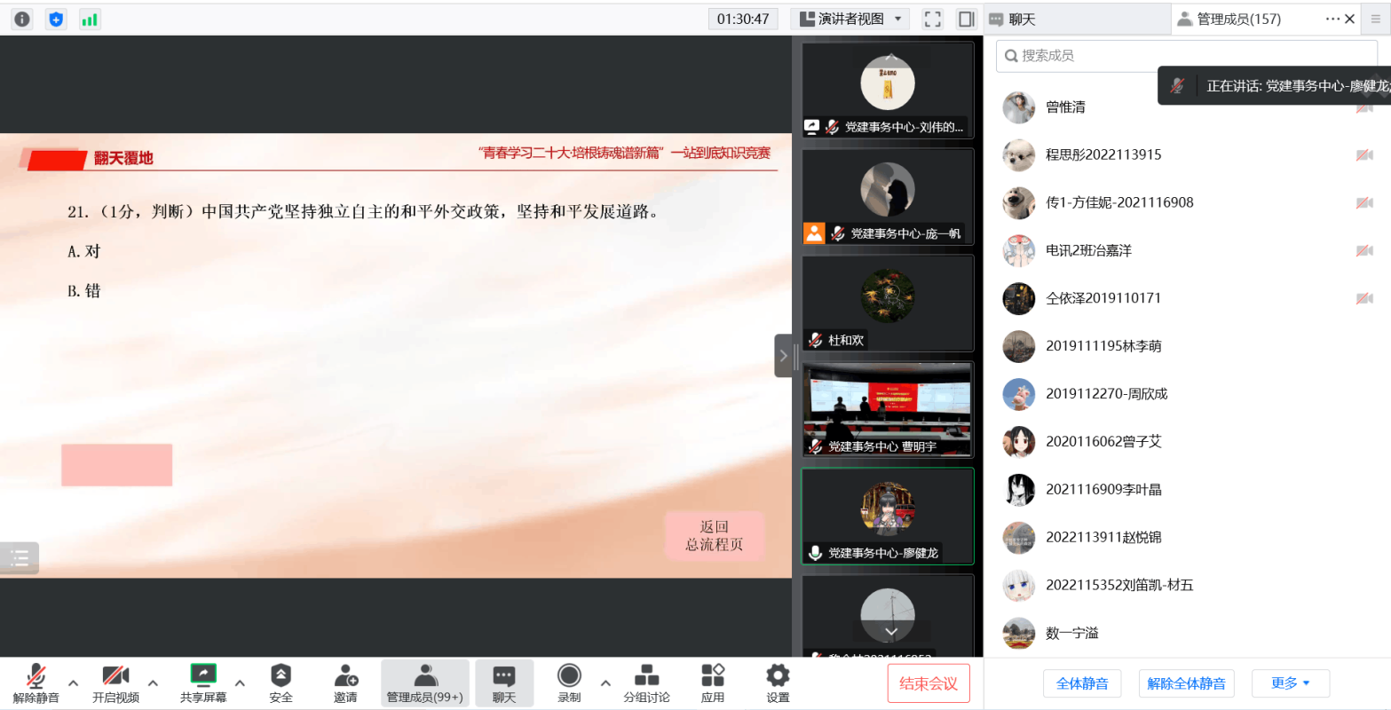 本次活动以知识竞答的形式,号召同学们关注时政热点、深化理论武装、赓续红色血脉,不断拓宽对四史、团史、校史等相关知识的认识。雄关漫道真如铁,而今迈步从头越,愿我辈青年能初心如磐,砥砺前行,踔厉奋发,笃行不怠,将个人微光汇入党和国家的星辰浩瀚。至此,“青春学习二十大·培根铸魂谱新篇”——一站到底知识竞赛决赛圆满落幕!