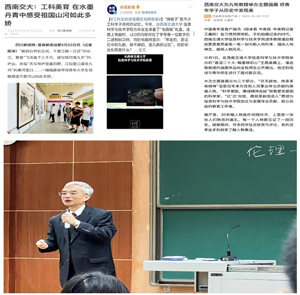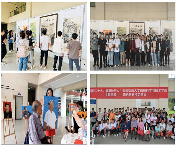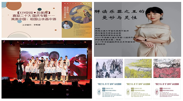 学院依托“第二课堂”成绩单制度,开展艺术美育理论教育和课外实践。《喜迎二十大 国庆专题——浅游中国:祖国山水画中游》、《解读乐器之王的曼妙与灵性》等主题讲座,引导学生从视觉到听觉提升艺术修养;“喜迎二十大,同‘芯’绘中华”主题画展、“喜迎二十大,翰墨映初心”主题画展、“百年正荣,强国有我”摄影展,将省内知名老艺术家与交大师生所作主题山水画、所拍摄摄影作品在信息楼展出,实现信息楼每月有视觉艺术展;“礼赞百年,以芯传信”“学习二十大、永远跟党走、奋进新征程”歌咏比赛,将在声乐艺术实践中引导学生全员参与、唱响青春曲目,实践声乐艺术育人;邀请学院退休教师分享退休后学习油画经历、讲解所绘制的革命伟人、校史人物,号召青年学生爱国爱校、终身学习。