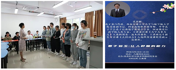 每学期邀请唐丽娟老师、孔祥彬老师分别为本研学生开展礼仪讲座、传统文化讲座,并将礼仪与传统文化与同学们的为人为事相结合,在日常生活中懂礼、用礼。