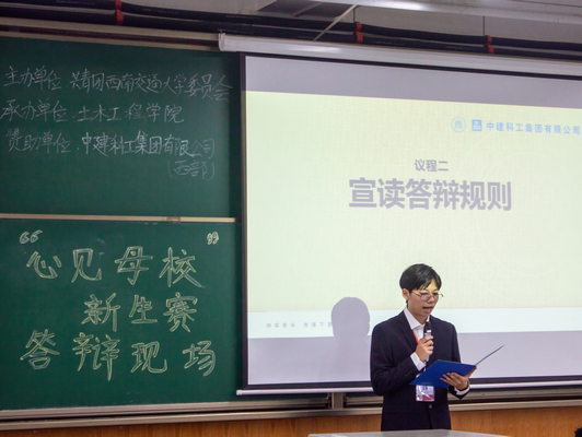 比赛伊始,由主持人苏坤阳同学为大家介绍本次活动所邀请的嘉宾评委:中建科工四川公司天科创智项目总工程师张炳宏,土木工程学院2022级新生辅导员老师以及土木团学组织部分学生干部。现场的同学以及工作人员们对各位评委的到来表示了欢迎以及感谢。