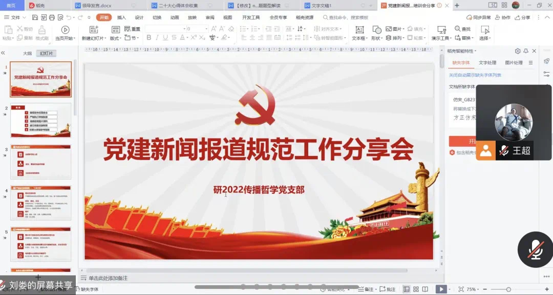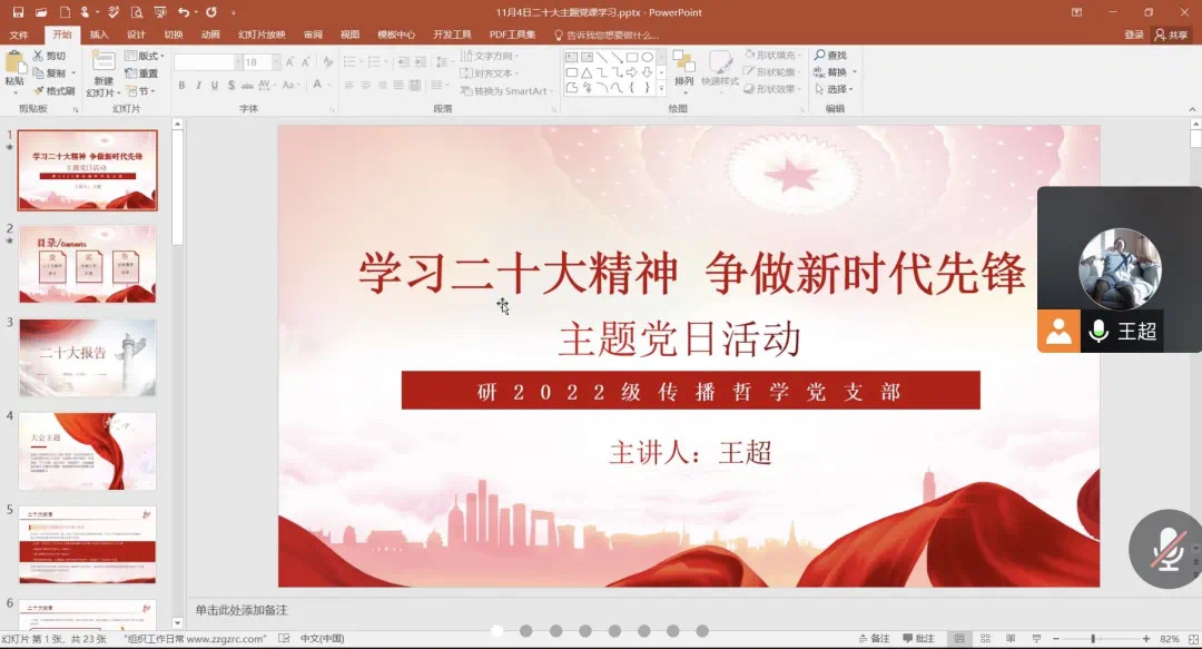 为深入学习贯彻党的二十大精神,2022年11月4日晚8点,人文学院研2022级传播哲学党支部以线上会议的形式开展了“学习二十大精神,争做新时代先锋”主题党日活动。本次活动由研2022级传播哲学党支部和人文学院研究生会临时党支部共同举办,主讲人分别是研2022级传播哲学党支部书记王超和宣传委员钟国玲。