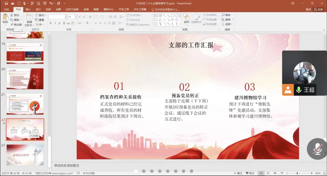 接着,王超对近期的党支部工作进行汇报,主要分为档案查档和关系接收、预备党员转正、建川博物馆学习参观计划这三方面的工作说明。王超强调党组织关系接收的重要性,并督促5位预备党员准备转正事宜,最后鼓励大家积极参与党建活动。