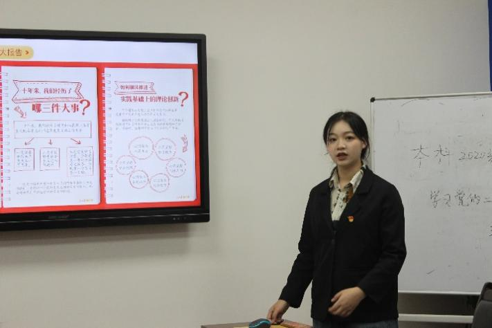 来自公共管理学院2020级本科政治二班团支部的中共预备党员鞠松男向支部成员介绍了自己的家乡——河北省唐山市自十八大以来的变化:自党的十八大以来, 唐山市坚持“绿水青山就是金山银山”,通过推动重工业转型,城市空气污染情况得到巨大改善。“以前我们家里头都经常能摸到一层的灰,现在再也没有了!”