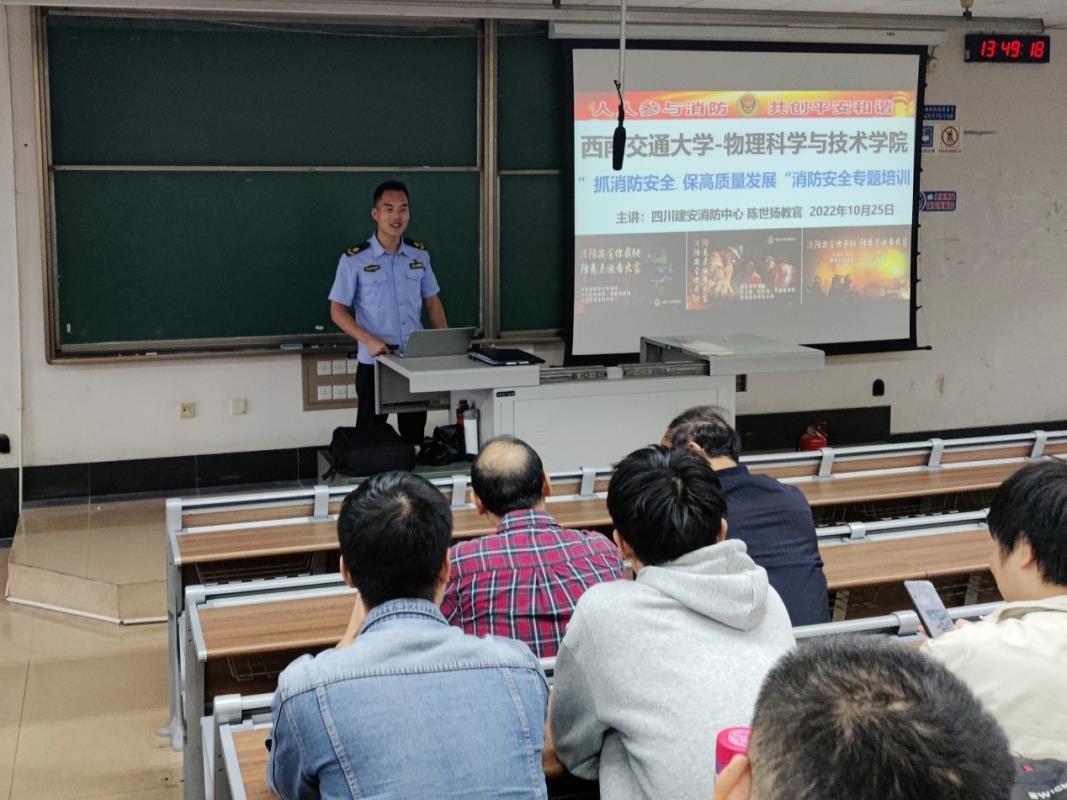 为响应11.9消防安全日主题“抓消防安全,保高质量发展”,进一步加强学院实验室安全管理,有效预防实验室安全事故发生,强化学院师生的安全责任意识,提高学院师生的自我保护能力,切实保障学院实验室工作正常有序开展,物理科学与技术学院于2022年10月25日下午14:30在九里4409教室开展了消防安全专题培训会。本次培训由四川建安消防中心陈世扬教官主讲,学院研究生辅导员杨昊戬主持,学院高温高压物理研究所与聚变科学研究所的全体师生近100余人参与了本次培训。