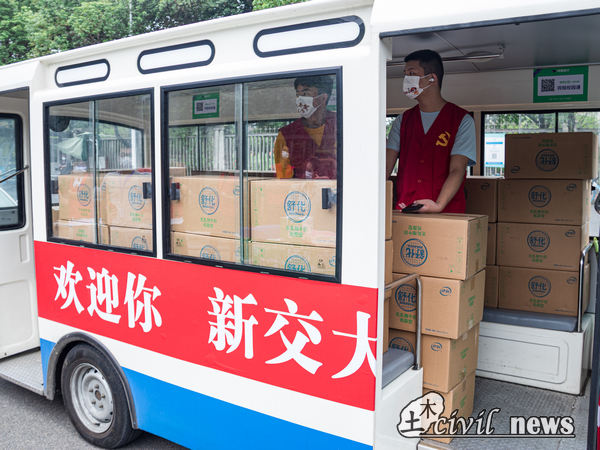 物资进入校园后,由现场辅导员老师进行分配,并由校内物资运送车辆将它们运送至对应的学生寝室园区。