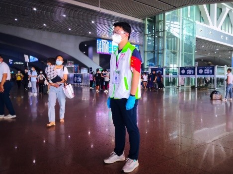 2022年7月7日至7月14日,实践队员于广州南站参与志愿引导服务。期间,实践队员分别在广州南站站厅各出口、站内地铁站口、售票厅处参与了不同岗位的服务。不同岗位的主要服务内容有所不同,成员们通过资料培训和现场实践完成了对站厅的功能分布的熟悉,更全面地帮助前来问询的旅客。面对新冠肺炎疫情防控的要求,志愿者上岗期间要求严格执行个人防护的要求,保护好自己才能更安全地服务广大到站旅客。