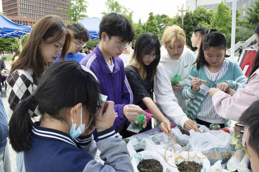 请茶、洗茶、泡茶……动作一气呵成,由茶文化协会协办的中华茶饮体验项目显得宁静与悠闲。不同的容器中,放着颜色、形态各异的茶叶,同学们根据常识来识别茶叶的种类与名称,从中学习茶文化知识,还可以品上一杯香茗,细细体验茶文化魅力。