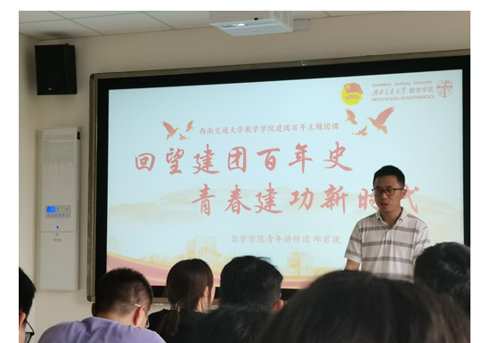 数学学院团委书记邓思然前往应用数学2020级2班团支部开展了“回望建团百年史,青春建功新时代”的主题团课,带领团员青年们回顾了中国共产主义青年团的100年光辉历程。通过对中国共青团的历史沿革以及重要历史事件的讲述,引导团员青年对中国共青团有了更加深刻的认识。同时,邓思然也号召广大团员青年们把握新机遇、建功新时代,坚定理想信念、站稳人民立场、练就过硬本领、投身强国伟业,充分发挥青年生力军和突击队作用。