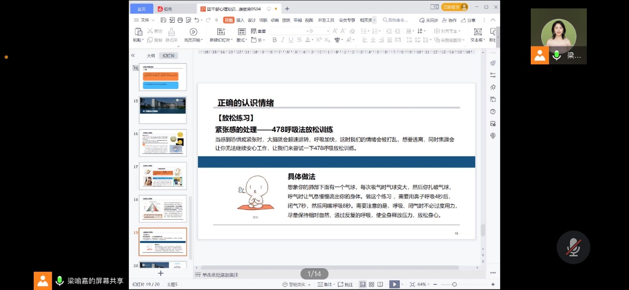 学习心理知识,提升心理素质。材料学院青年讲师团成员梁喻嘉为参训学员主讲“团学干部心理知识普及心理健康教育”,从青年学生普遍面临的心理问题入手,结合典型案例分析,深入浅出地向同学们普及心理知识,旨在帮助他们提升应对挫折、调整心态的能力,以更加乐观的心态面对未来的学习、工作和生活。针对当前大学生群体心理问题越发突出的情况,梁喻嘉老师专门为学员们传授了如何发现和应对心理危机、如何帮助面临心理问题困扰学生的经验和方法。