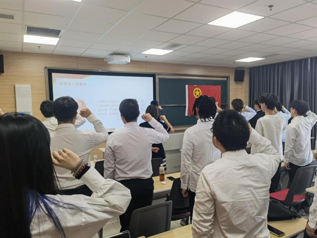 在陆宇佳的带领下,新团员面对着鲜艳的中国共青团团旗,举起右手,向团组织庄严宣誓。全体到场团员也与新团员一起重温入团誓词。大家声音嘹亮,气势豪迈,斗志昂扬,充满青春活力。