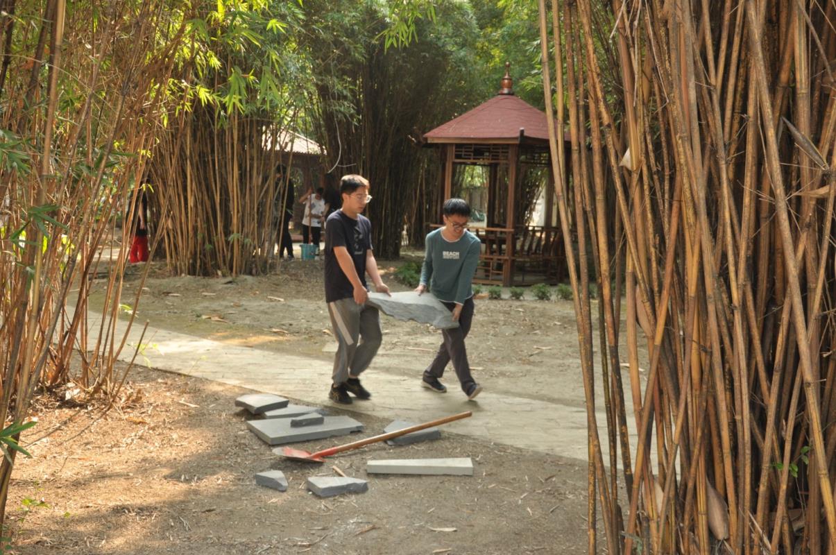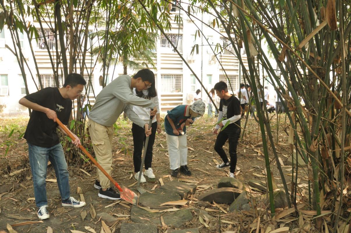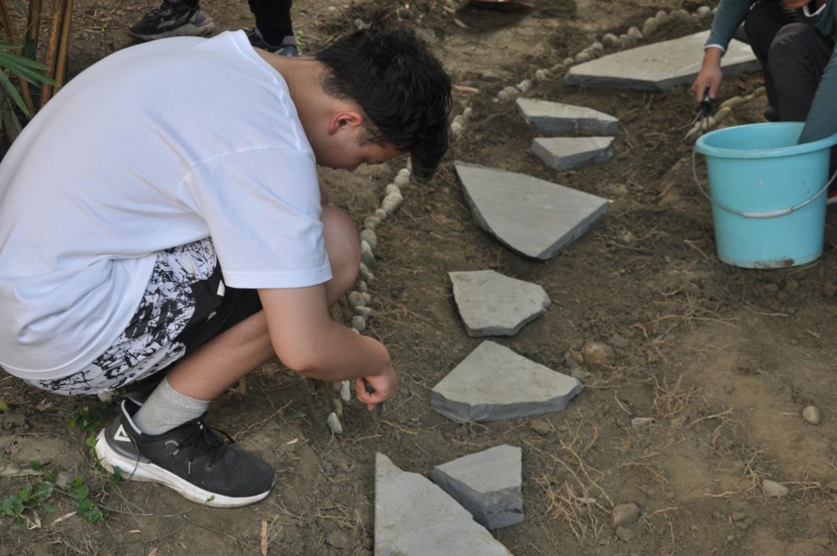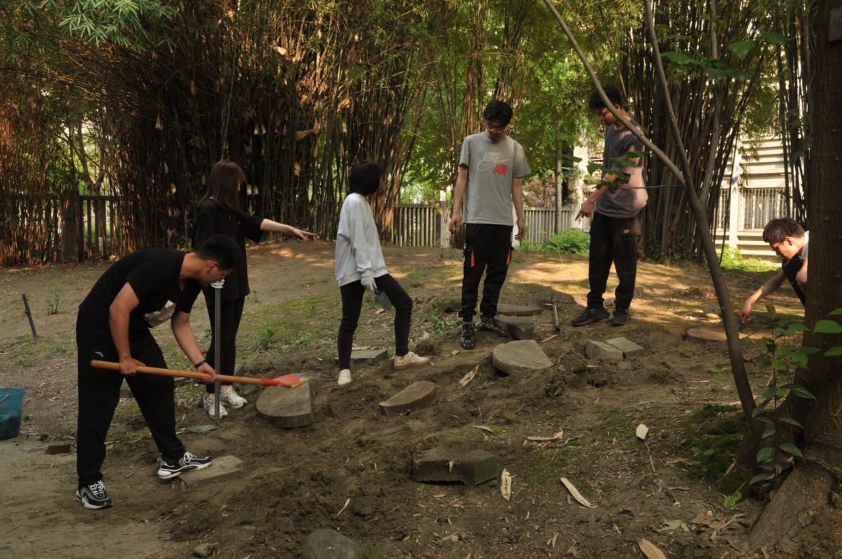 由于每个小组铺设小径各有不同,所需解决的问题不同,同学们身体力行,集思广益,积极完善本组的小径铺设方案,就地取材,利用书院周边的建筑材料来铺设小径。有同学负责挖掘小路雏形、有同学负责捡拾鹅卵石、有同学负责清理青苔、有同学负责搬石板……大家合理安排,分工合作,忙得不亦乐乎,材料收集和路径开凿同步进行,大大缩短了铺设所需时间。随着时间的推移,小径初具雏形,尽显同学们的创造力。