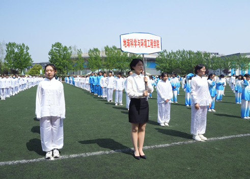 撑开一片天,划出一道云。地学学院代表队的队员们个个身穿太极服,以方阵队形散开,依据两种颜色的服装搭配构成八卦图案。抬手、跨步、抱球、横档,一个个动作伴随着二十四式简化太极拳的音乐打出,展现出一番别样的风采。阴阳融合,刚中带柔,打出了太极的传统内涵。从野马分鬃到十字手,从搂膝拗步到双峰贯耳,整齐划一、情绪饱满充沛的动作打出了同学们团结的精神,获得了裁判们的一致好评。