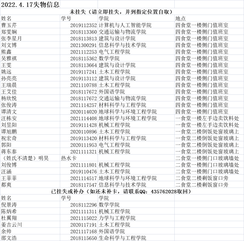 线下,在本学期的5到8周的周二、周五和周日,志愿者去到南区、北区的食堂和园区收集失物信息,整理登记到表格中,并在当天由失物招领官方账号发布,以便同学们查看并领取自己的一卡通。同时,对已失效或挂失的一卡通进行统一存放,并将食堂的一卡通进行整理放置。
