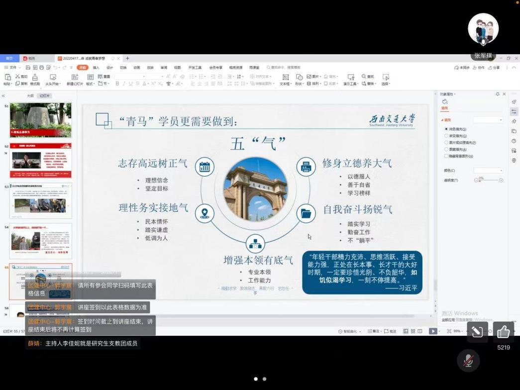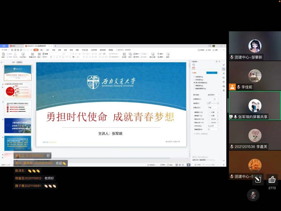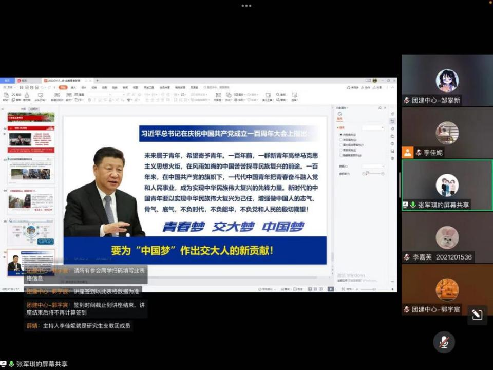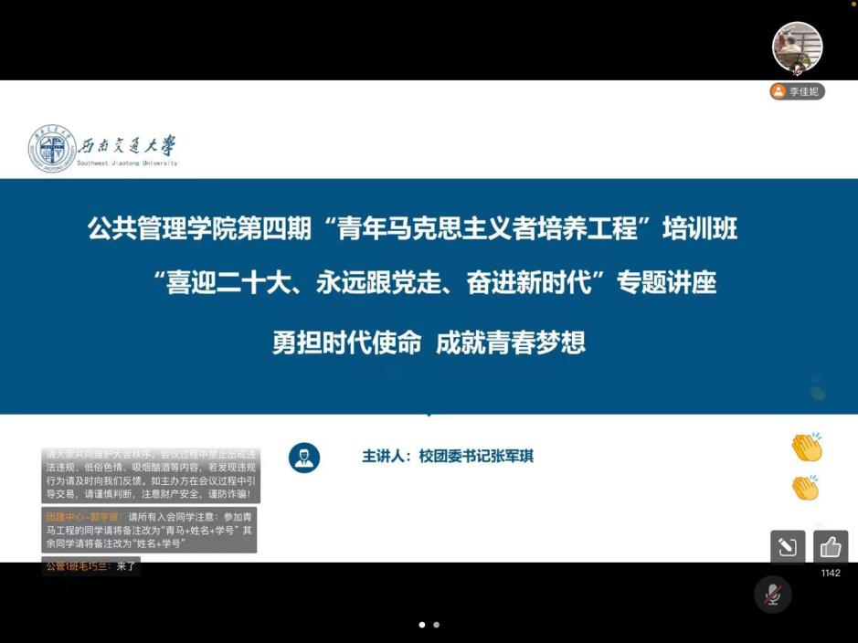 “青年一代有理想、有本领、有担当,国家就有前途,民族有希望。”青年的思想政治工作与巩固、扩大青年群众基础一直是党的重要任务之一,也是习近平总书记深深牵挂、在多次会议上作出重要论述与批示的议题。公共管理学院始终重视青年工作和青年骨干培养工作,坚持学生主体地位,以学生成长和发展为中心,定期开展“青马工程”,以实际行动团结引领广大青年坚定跟党走、建功新时代。通过理论知识学习促进青年坚定理想信念,以实际行动促进青年担当时代使命,以优异成绩喜迎党的二十大。2022年4月21日晚7时,学院团委特邀校团委书记张军琪老师于线上开展“勇担时代使命,成就青春梦想”专题讲座。公共管理学院第四期“青年马克思主义者培养工程”培训班全体学员及广大团员青年参加了本次讲座。