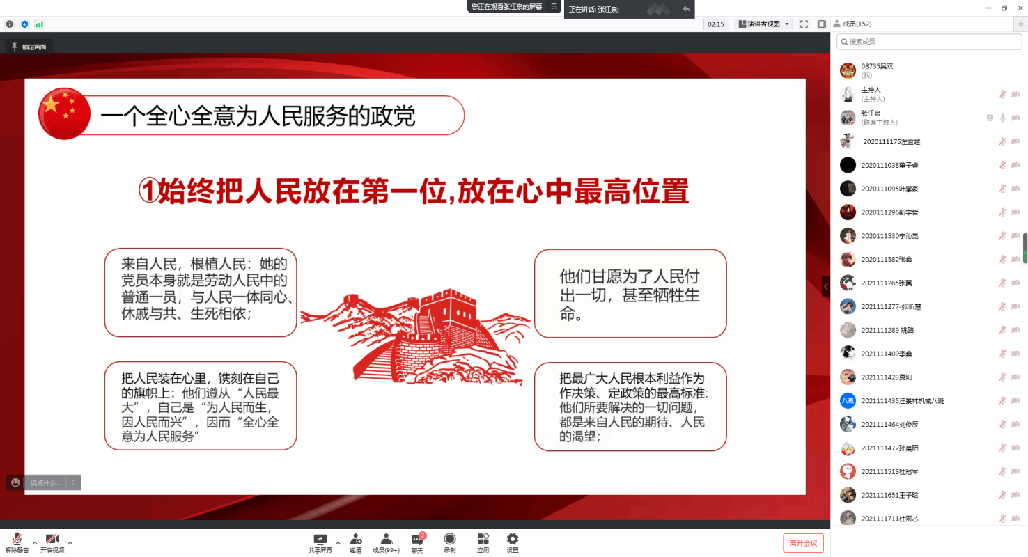 一、中国共产党是一个全心全意为人民服务的政党!张老师指出:“共产党来自人民,植根人民,与人民一体同心,休戚与共,生死相依。”中国共产党始终把人民作为靠山,把人民当家作主作为矢志不渝的奋斗目标,把人民的幸福生活作为自己的不懈追求!打江山,守江山,守的就是人民的心。