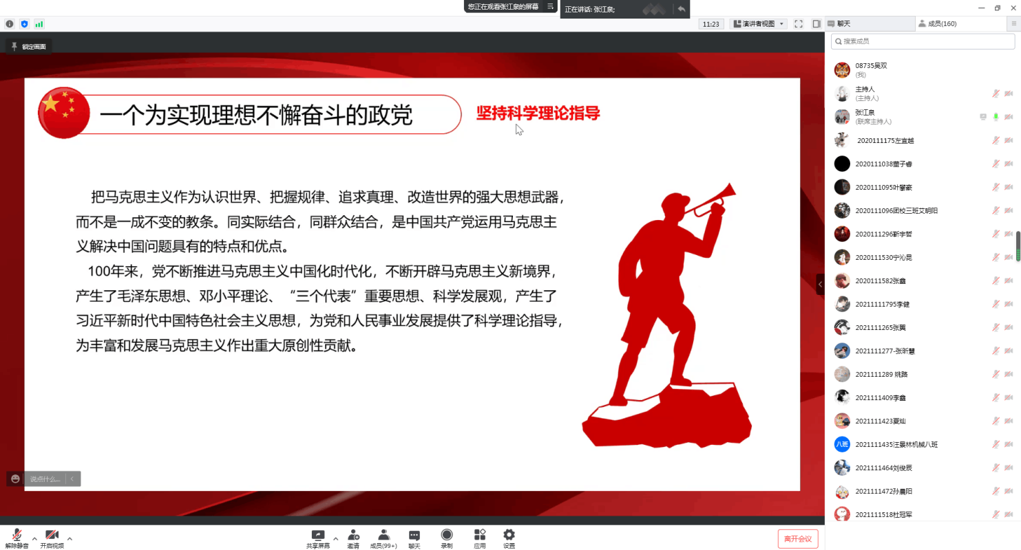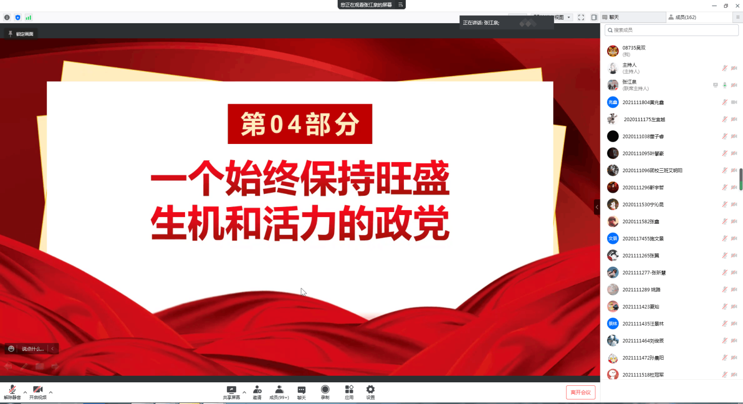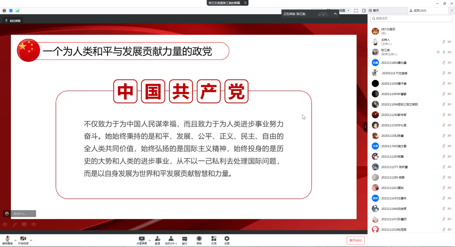 在建党一百周年纪念大会上,习近平总书记强调:“未来属于青年,希望寄予青年。一百年前,一群青年高举马克思主义思想火炬,在风雨如晦的中国苦苦探寻民族复兴的前途。一百年来,在中国共产党的旗帜下,一代代中国青年把青春奋斗融入党和人民事业,成为实现中华民族伟大复兴的先锋力量。” 当代青年应学习党的初心和使命,感悟青年信念与力量。本期团课在张江泉老师的生动讲述下,让所有青年团员对中国共产党有了更深层次的了解。