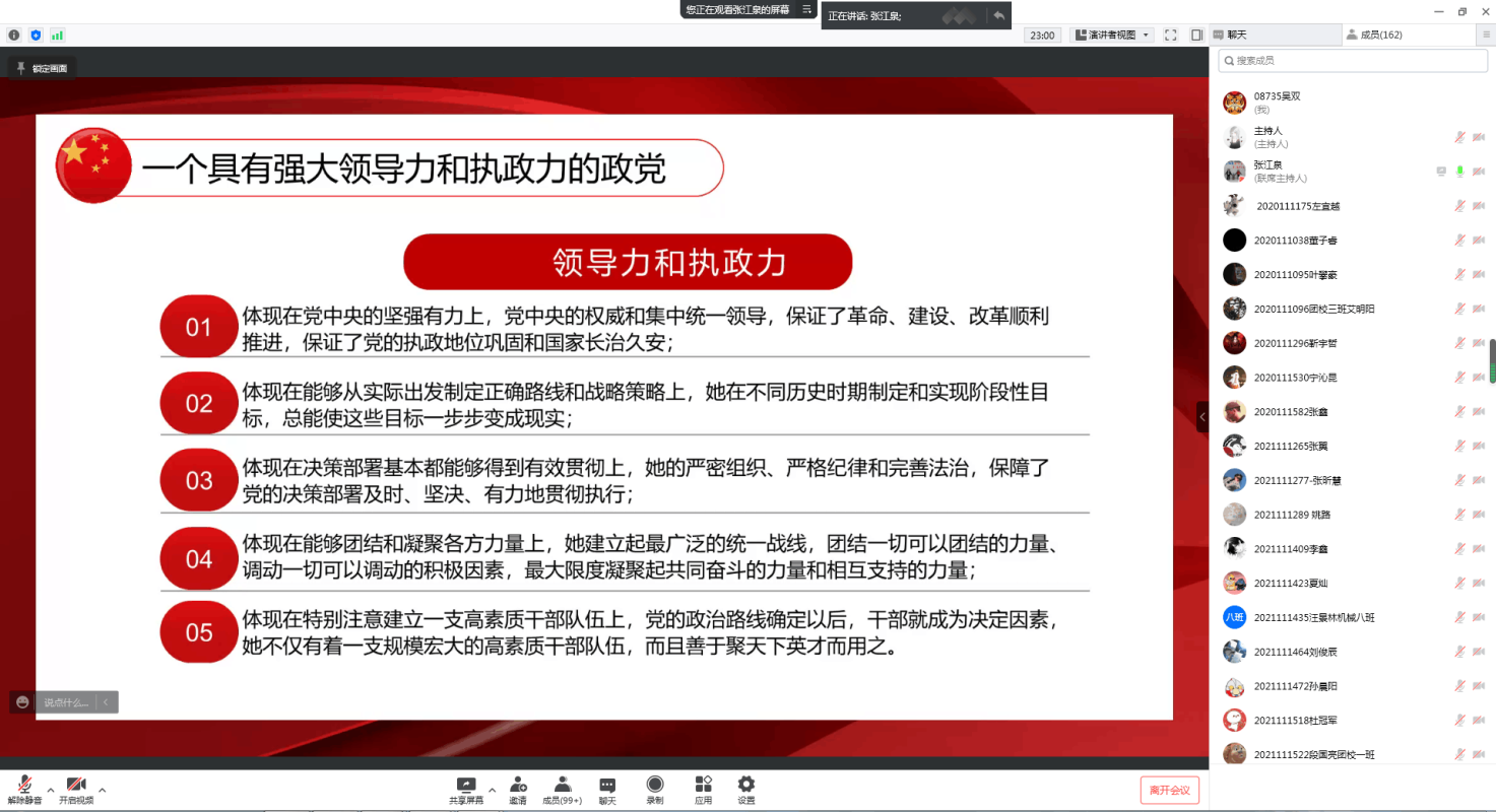三、中国共产党是一个具有强大领导力和执政力的政党!张老师表示:“强大的领导力执政力,在于党中央坚强有力,中央政权坚强有力,维持大一统局面,国家才能富强、安宁、稳定,人民才能安居乐业。”中国共产党强大领导力执政力不仅体现在强有力的统一领导和执政地位的巩固、国家战略策略的正确制定、决策部署有组织有纪律地有效贯彻、能够建立与群众的骨肉联系以及团结和凝聚各方力量;而且还体现在干部队伍的高素质,能够聚天下英才而用之,这充分表明了:中国共产党是中国特色社会主义事业的领导核心。