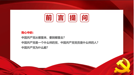 中国共产党从哪里来、要到哪里去?中国共产党是一个什么样的党,中国共产党员是什么样的人?中国共产党为什么能?首先,张老师以我们心中的共产党为题进行发问,引发团员们的思考,并引出本次团课以下五点主要内容。