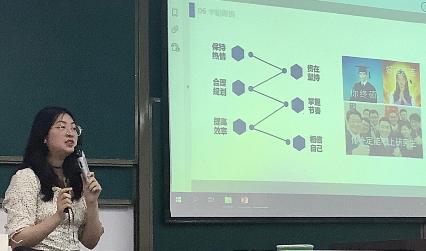 “认真聆听了2018级保研、考研成功的学长学姐们的分享,让我对保研的流程得到了进一步的了解,让我意识到要多关注理想院校夏令营、预推免、正式推免的消息。在努力学习专业知识的同时,要多拓展其他一些领域的知识,多关注学术热点、养成阅读学术专著的习惯。此外,从这些优秀的学长学姐身上我还意识到,她们如今的成绩离不开背后日复一日、苦中作乐地不断努力。我将以分享的这四位学长学姐为榜样,希望两年后的今天,我也可以像他们一样不留遗憾!”