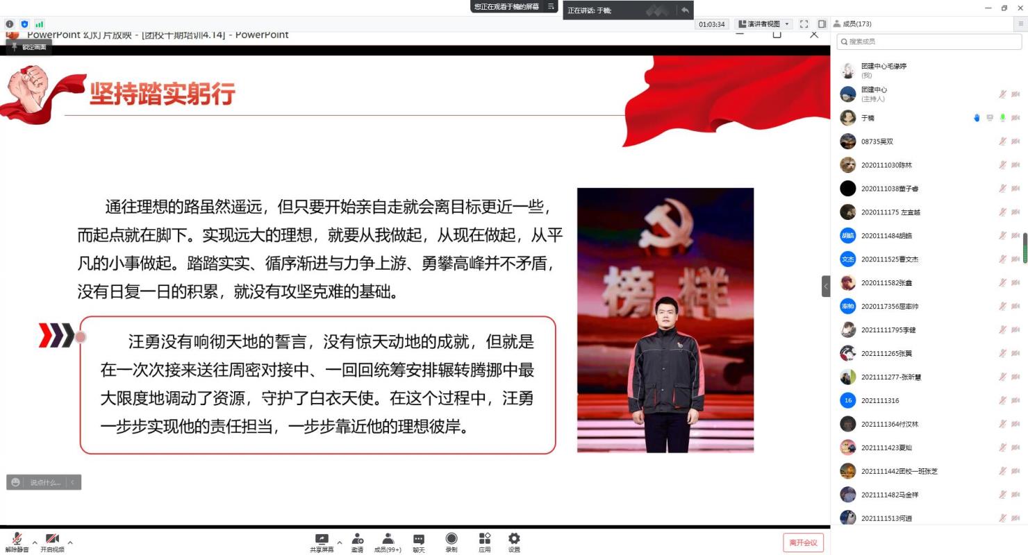 三、 坚持踏实躬行:“谁说站在光里的才算英雄?谁说站在舞台中央的才算明星?”,于楠老师接下来为大家介绍了荣获第二十四届“中国青年五四奖章”的凡人英雄——汪勇。他在金银潭医院奔波忙碌的感人事迹表明,平凡和伟大其实并不矛盾。他们都是平凡人。但在国家的危难关头,他们克服了困难,出现在需要帮助的人面前。那时,他们就是伟大的人。于楠老师总结道:“每一个平凡人在时代中都做着不平凡的小事。对于快递小哥汪勇而言,人生理想的实现就是每一份快递的平安送达。每一个平凡人,脚踏实地地去实现自己的梦想,脚踏实地地做好自己的工作,都是凡人英雄。” 这种踏实躬行的态度是青年应该坚持的,是实现伟大理想的重要方法。