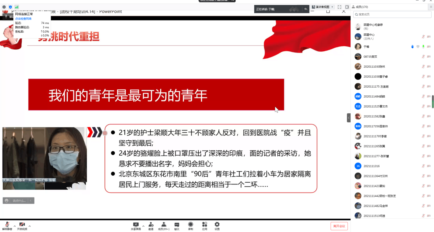 一、 坚定远大理想:于楠老师以不同时代的青年奋斗事迹举例,说明现代青年为什么要有远大的理想。上世纪三十年代国家蒙难之时,那批秉持着家国情怀和时代理想的热血青年们抛头颅洒热血,为祖国、民族而奋斗,书写了抗日战争的奇迹。1.2万名90后援鄂医护工作者,胸怀打赢疫情防控阻击战的坚定决心,不怕苦不怕累,全身心地投入到疫情防控工作中,终于把武汉疫情控制住,保障了人民的生命财产安全。最后于楠老师特意为团员们介绍了我校机械工程学院的学长——周泽民,在危急时期他临危受命参与火神山医院的建设,令在座的团员感到无比自豪。