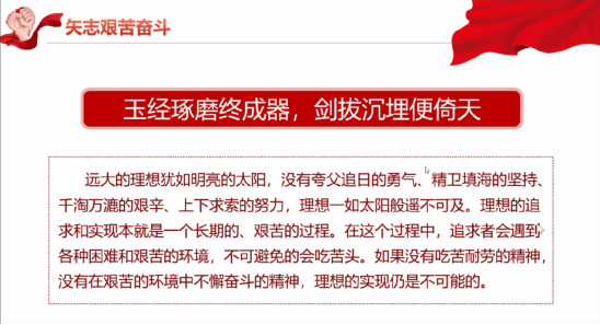 四、 矢志艰苦奋斗:玉经琢磨终成器,剑拔沉埋便倚天。于楠老师说:“理想一定是不容易实现的,实现理想需要克服无数的艰难险阻,但这正是强化理想信念的必经之路。”作为新时代青年,我们任何时候都要坚持艰苦奋斗的精神,努力做新时代的的合格建设者和接班人。