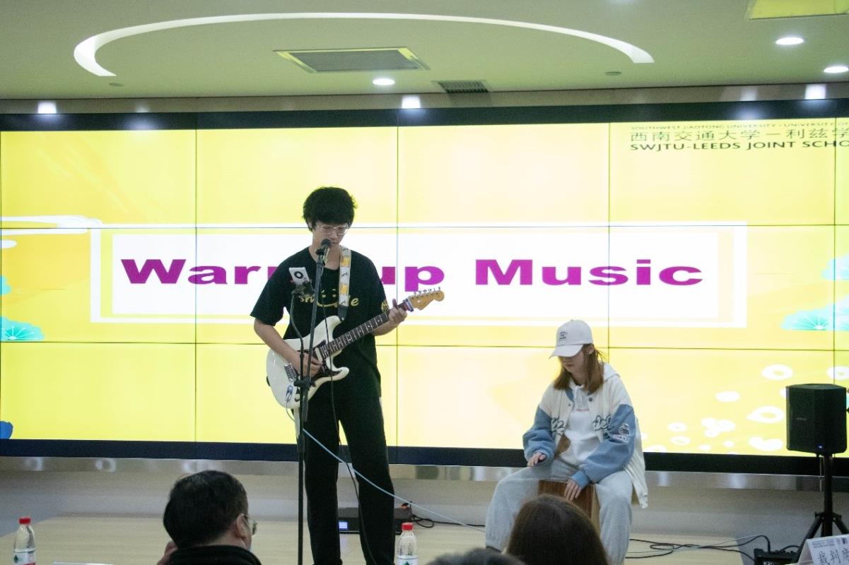 比赛正式开始前,利兹学院19级学生张允擎带来吉他弹唱表演,现场气氛瞬间被带动起来。